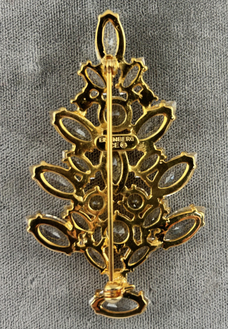 Christmas tree pin in bright gold tone finish with clear unfoiled navette and round rhinestones. Like new condition. Size is 1 3/4" X 2 3/4". Signed Eisenberg Ice.