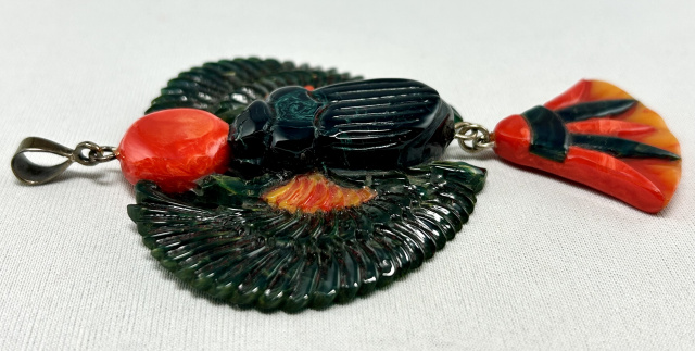 Large Egyptian pendant in translucent blue moon, marbled butterscotch and marbled orange features a sun, carved scarab, carved feather wings and a laminated triangular dangle in 3 colors. Measurements are 4 1/4" tall X 2 5/8" across.