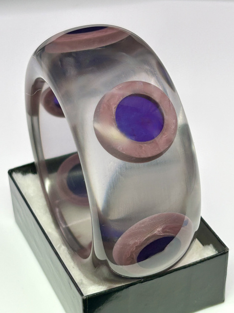 Judith Evans octopus eye bangle in transparent smoky amethyst with dots in transparent purple and marbled pinkish lavender measures 1.5" wide with 2 9/16" wrist opening and 1/2" wall thickness.