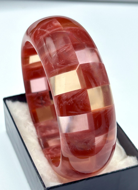 Judith Evans resin 2 row checkerboard bangle in marbled dark rose pink, transparent pink and applejuice. Bangle measures 1 1/8" wide X 2 5/8" wrist X 3/8" wall thickness.