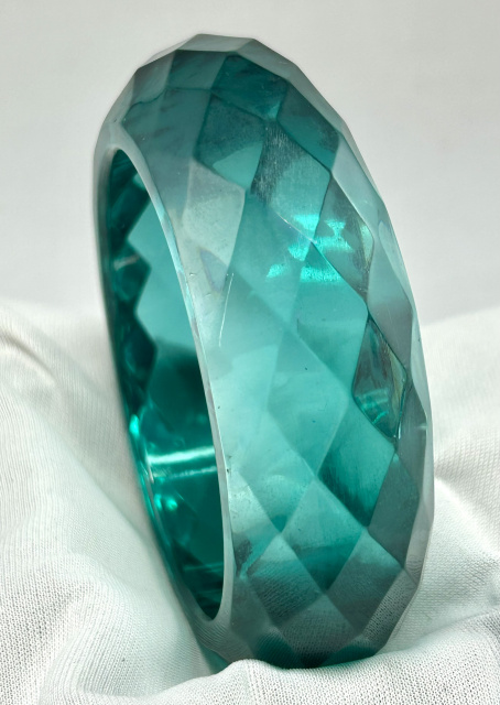 Chunky diamond faceted transparent teal lucite bangle measures 1" wide X 2.5" wrist opening X 1/2" wall height.