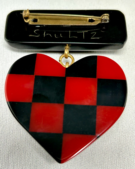 Signed Shultz bakelite 4 layer checkerboard heart pin in marbled yellow, blue moon, red and black on black bar, measures 2 1/8" X 2 3/4".