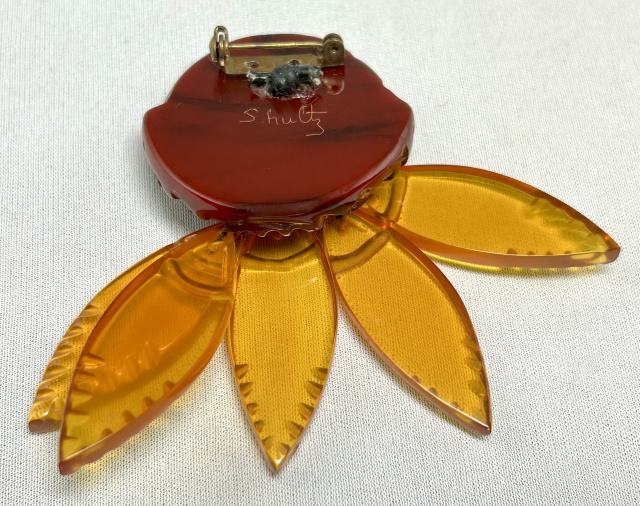 Shultz fish basket pin with mahogany swirl Bakelite basket and five applejuice fish. Small prong set pin back. The basket measures 1 1/2" X 1 9/16" and each fish measures 1 3/4". This is a rare Shultz pin, one of only 2 made.