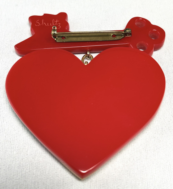 Shultz large red Bakelite key to my heart pin, with laminated stripes on the heart in yellow, red, medium green and blue. Pin measures 2 7/8" X 2 15/16".