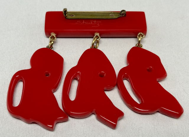 Rare "see no evil, hear no evil, speak no evil" Shultz signed red Bakelite pin. Bar measures 3 1/2" across and each monkey measures 1 1/4" X 2".