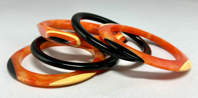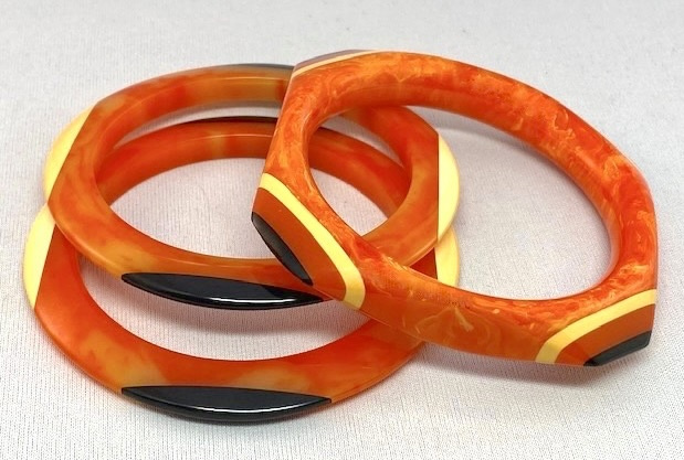 Shultz marbled orange Bakelite bangle set. The largest bangle is a rounded square with laminated corners of cream, solid orange and black. It measures 1/2" wide with 2 1/2" inside diameter and varying wall widths up to 5/8". The pair of accent bangles have oval dots in cream and black. They measure 1/4" wide with 2 1/2" wrist and 3/8" wall thickness.