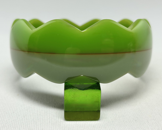 Reverse zigzag bangle in pale blue grey and lime green bakelite measures 1" wide with 2 9/16" wrist opening and 1/4" wall thickness. This bangle was polished several years ago and now is regaining the oxidation.
