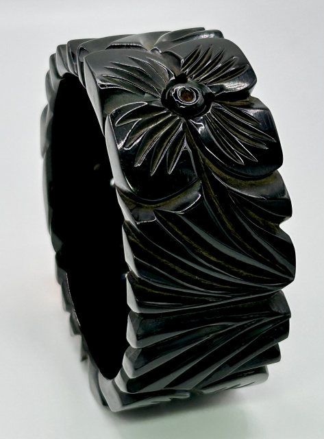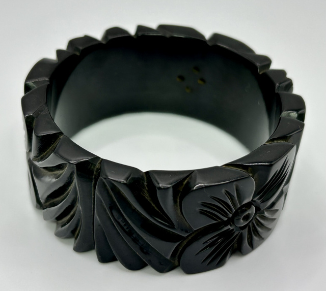 The darkest of greens, as close to black as you can get straight edge dogwood flower carved bakelite bangle with four piercings around the flower centers. The pattern repeats 4 times. The bangle feels substantial and is very well made, measures 1 1/4" wide X 2 1/2" wrist X 5/16" wall thickness.