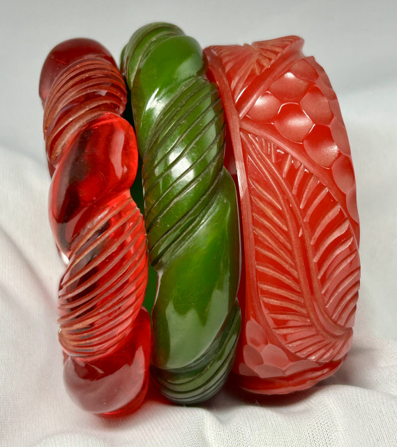 Deeply carved translucent red bakelite bangle with leaf and scoop carving, the pattern repeats twice around the bangle. The bangle measures 7/8" wide X 2 1/2" wrist opening X 3/8" wall height at the highest points.