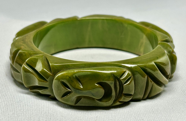 Unusual and rare tiki carved bakelite bangle in marbled olive green, measures a chunky 3/4" wide X 2.5" wrist opening X 3/8" wall thickness.