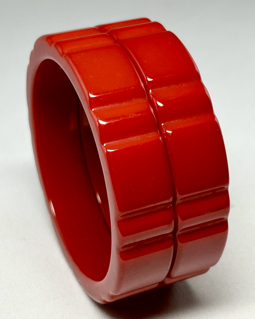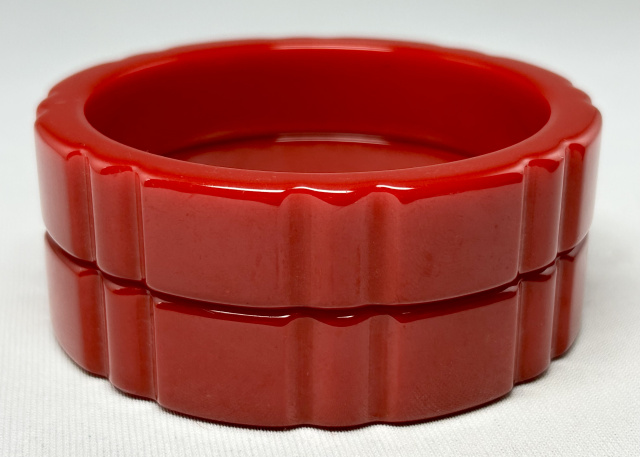 Pair of ruby red bakelite bangles with groove carving, dimensions are 3/4" wide X 2.5" wrist opening X 1/4" wall height.