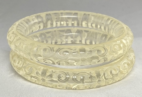 Pair of signed KJL carved clear acrylic (shows yellowing as clear acrylics will do), in the style of red cinnabar bangles. The bangles are tube style with round inside edges for ease of wear and measure 1/2" wide X 2 9/16" wrist X 3/8" wall height.