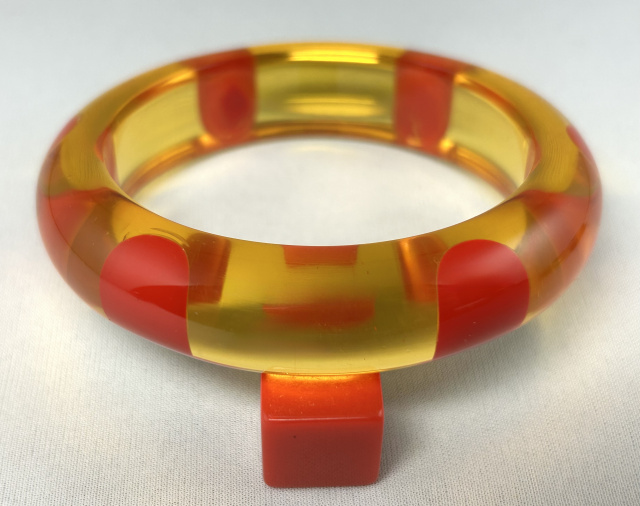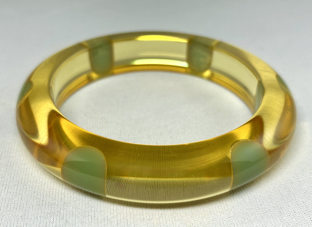 Brandon applejuice Prystal bangles with six side to side dots, one with bright red dots and the other with blue that will age to olive dots.