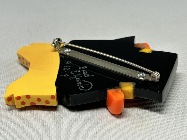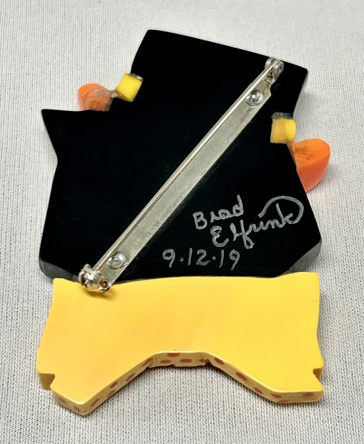 All bakelite Brad Elfrink black cat with top hat, bow and spectacle brooch/pin. Size is 2.5" long X 1 3/4" long with set in pin back. Brad makes a few special Halloween pins every year and collectors eagerly await what he's got in store for the season. This has never been worn, just lovingly admired.