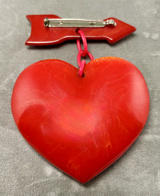 Marbled strawberry red bakelite puffy heart pin with red bakelite arrow.  This is the largest size of vintage bakelite heart pins measuring 2 3/4" across and 3 5/8" long, including the arrow. Pin back is a safety clasp in fine working condition, no rust.