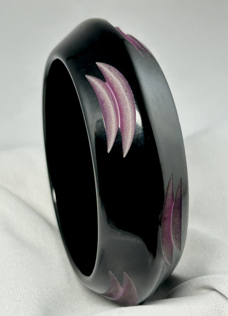 Overdyed and cutback lucite or bakelite bangle that's been overdyed in black and carved back to the purple color. Usually this type of overdyed bangle and carving is bakelite and there was most definitely purple bakelite but this is hard to test. Dimensions are 1" wide X 2 9/16" wrist opening X 7/16" wall height.