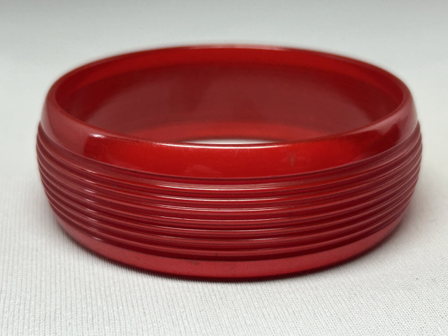 Transparent red Prystal (Bakelite) bangle with delicate rib carving, dimensions are 7/8" wide X 2.5" wrist opening X1/8" wall height.