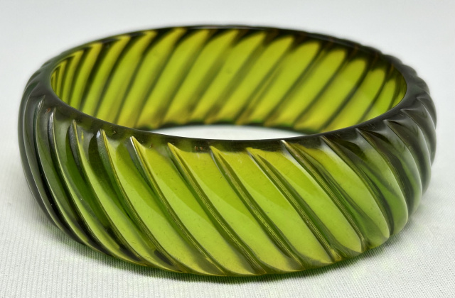 Rib carved olive green changer Prystal bangle is just starting to get a reddish tint along the edges. The bangle measures 7/8" wide X 2 1/2" wrist opening X 1/4" wall thickness.