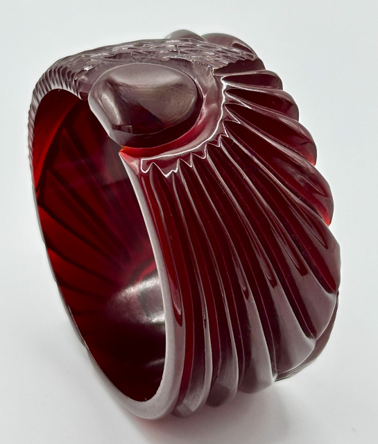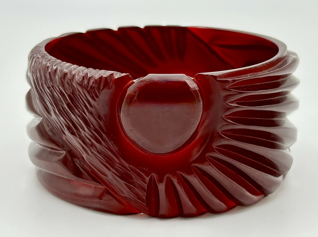 Vintage wide cherry amber or wine translucent sunrise or comet carved bakelite bangle. I've not seen this carving before, the elaborate carving and color make for an outstanding bakelite bangle. Measurements are 1 3/8" wide X 2.5" wrist opening X 1/4" wall thickness.