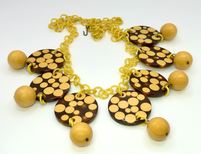 1950s Charles Elkaim brown with custard bakelite injected dots necklace on yellow celluloid chain. The seven brown and custard dot discs measure 1.5" in diameter and the custard bakelite beads measure 3/4" in diameter.