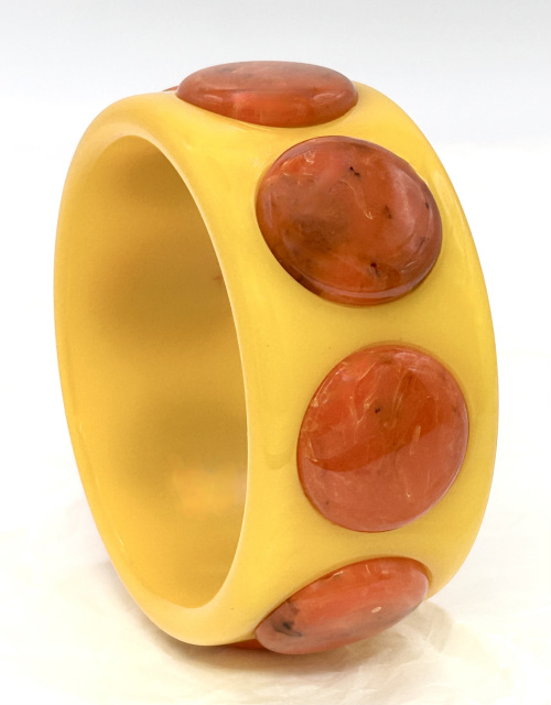 Wide translucent yellow bakelite bangle nicely patinaed to a warm mellow yellow features eight 1" raised inset dots in orange with black and yellow marbling. The bangle measures 1 3/8" wide with softly rounded edges. The wrist opening is 2.5" and the wall thickness is just shy of 3/8" at the dots.