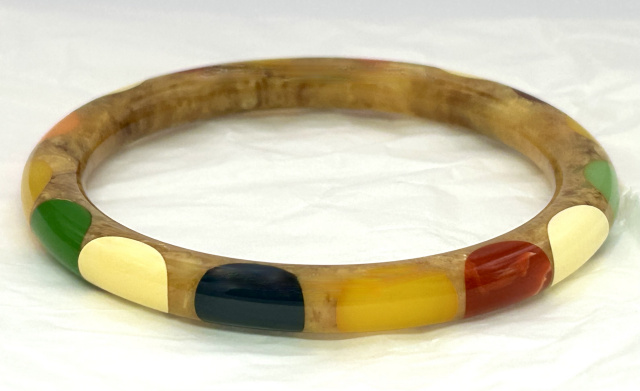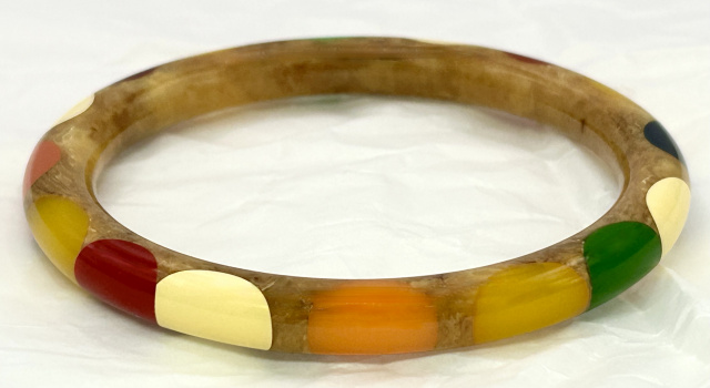 Shultz artisan bakelite tube style bangle with sixteen large wrap around dots in several colors. The bangle measures 5/16" wide X 2 9/16" wrist opening X 3/8" wall thickness.