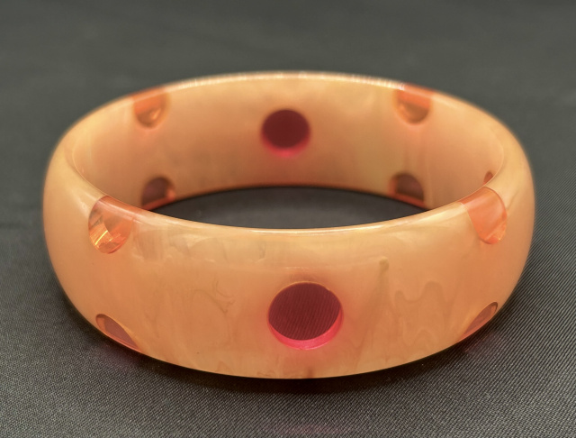 Atelier Papillon by Kent Munday delicate peach color marbled bakelite bangle with pink Prystal dots along both edges and along the middle. All the Prystal dots are pink but the angle viewed makes some of them look orange, an unusual optical illusion. This bangle has the 3 silver pins denoting the maker. Bangle dimensions are 13/16" wide X 2 9/16" wrist opening X 3/16" wall thickness.