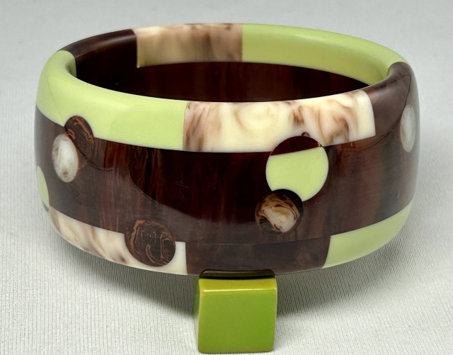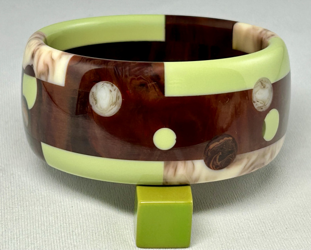 Atelier Papillon brickwork and dots bakelite bangle in avocado, marbled mahogany, and cream with chocolate. The bangle measures 13/8" wide X 2 9/16" wrist opening X 1/4" wall thickness.