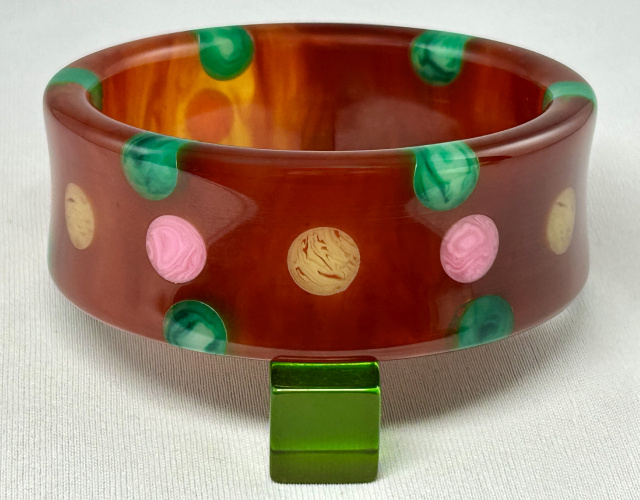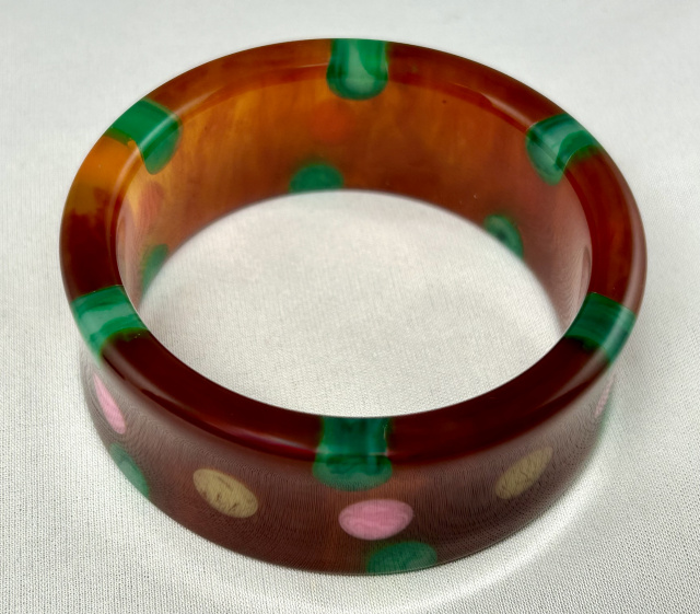 Wide, slightly concave marbled red tea bakelite bangle with marbled green edge dots, marbled pale pink and marbled butter dots along the center of the bangle. Dimensions are 1 1/8" wide X 2 5/8" wrist opening X 5/16" wall thickness.